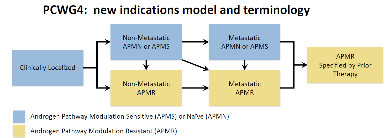 Uma das mudanças conceituais mais relevantes propostas pelo grupo é a revisão da terminologia tradicional baseada em “castration-sensitive” e “castration-resistant”. Esses termos foram definidos em uma era em que a principal intervenção hormonal era a privação androgênica isolada. No cenário atual, em que muitos pacientes recebem moduladores da via do receptor de androgênio (ARPI) ainda nas fases iniciais da doença, o PCWG4 propõe uma nomenclatura mais precisa: